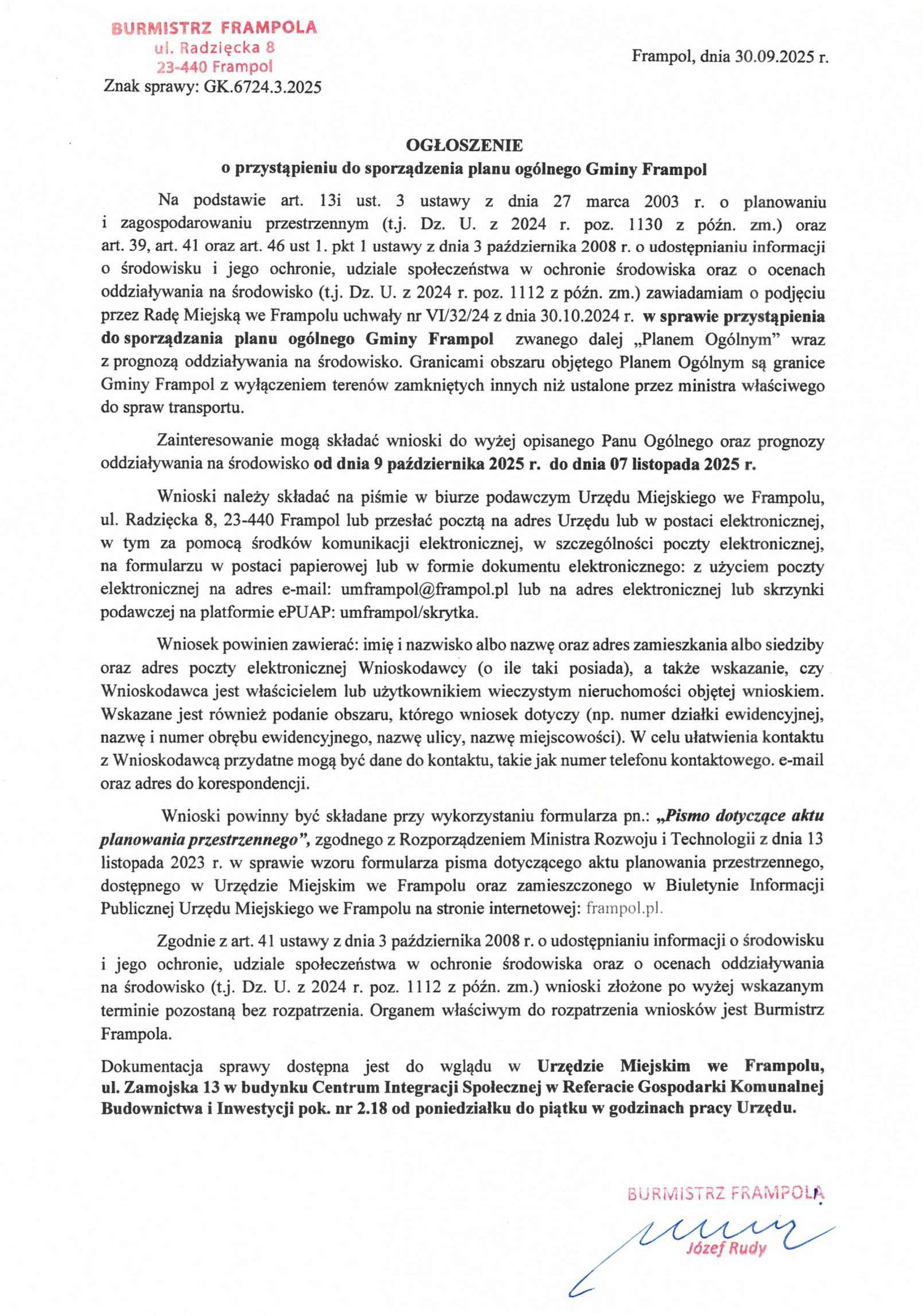 Ogłoszenie o przystąpieniu do sporządzenia planu ogólnego Gminy Frampol.